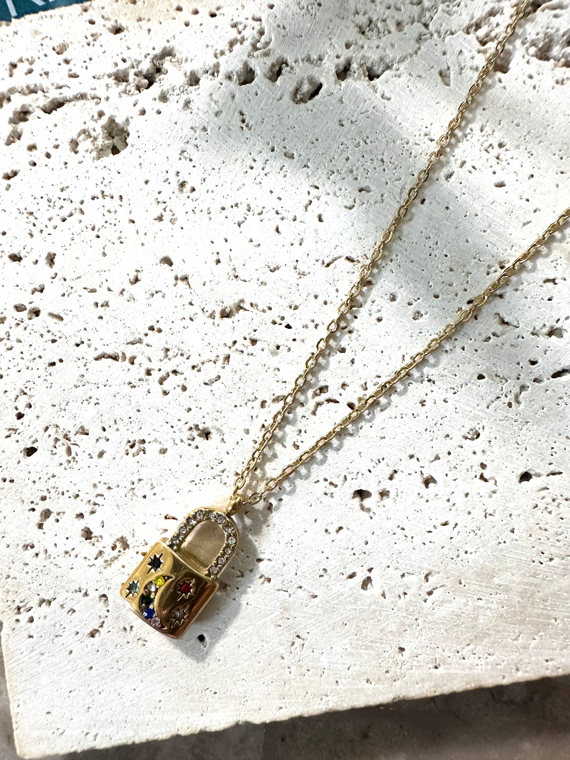 This stainless steel chain with a gold-tone padlock charm is a perfect combination of strength and style. Made of stainless steel, it guarantees durability and easy maintenance, while the padlock charm adds a modern and distinctive touch. The gold-tone finish gives it an elegant shine, making it ideal for enhancing both casual looks and more sophisticated ensembles.