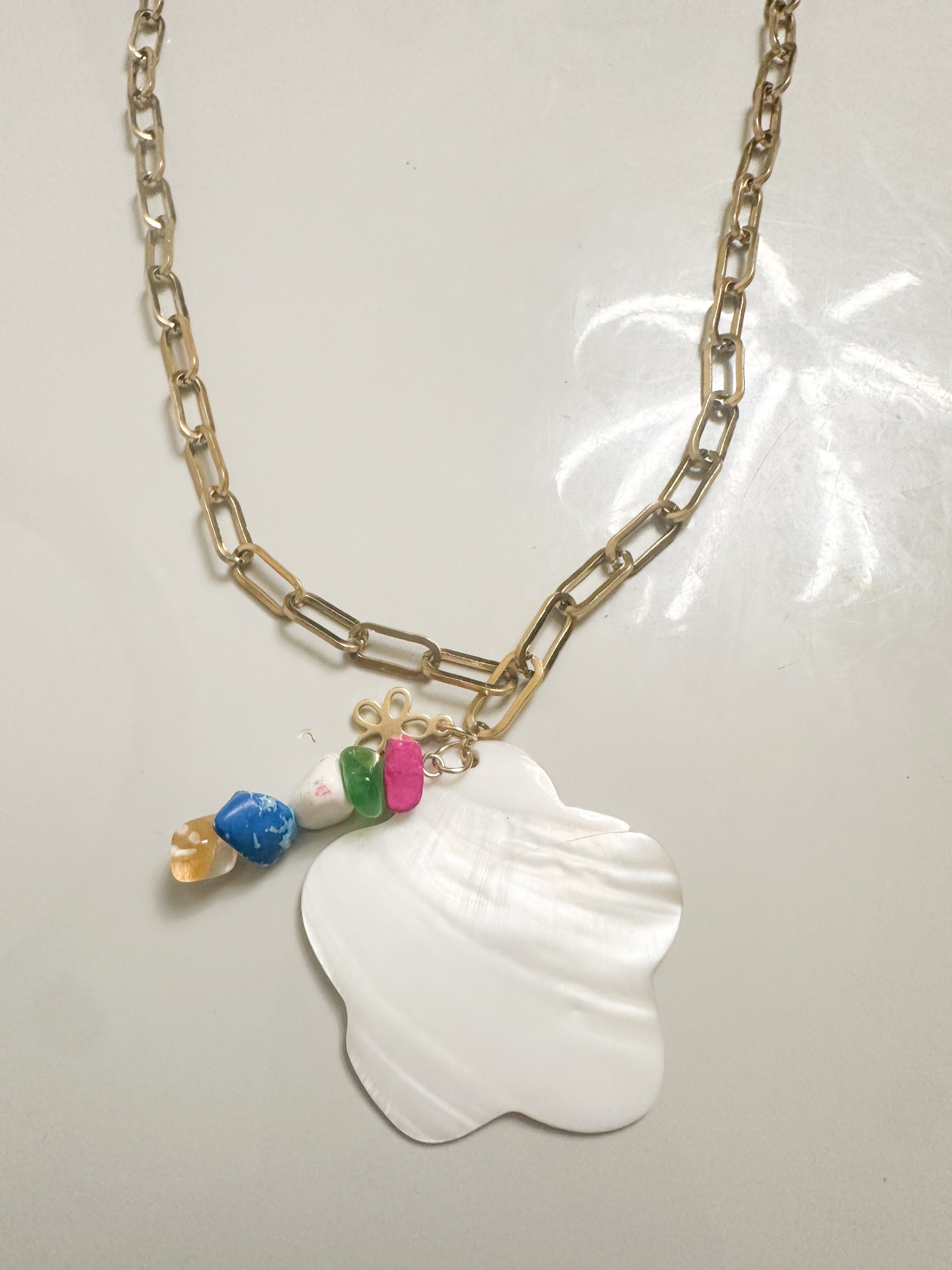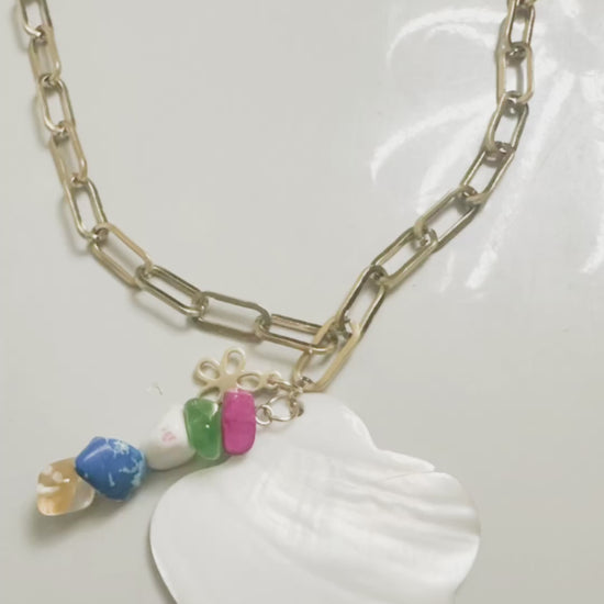 β¨ Elegance That Stands Out β¨ Our aluminum paperclip chain combines the delicacy of a mother-of-pearl charm with the vibrant touch of colorful gemstones. π Perfect for women looking for a unique accessory that highlights their personal style.