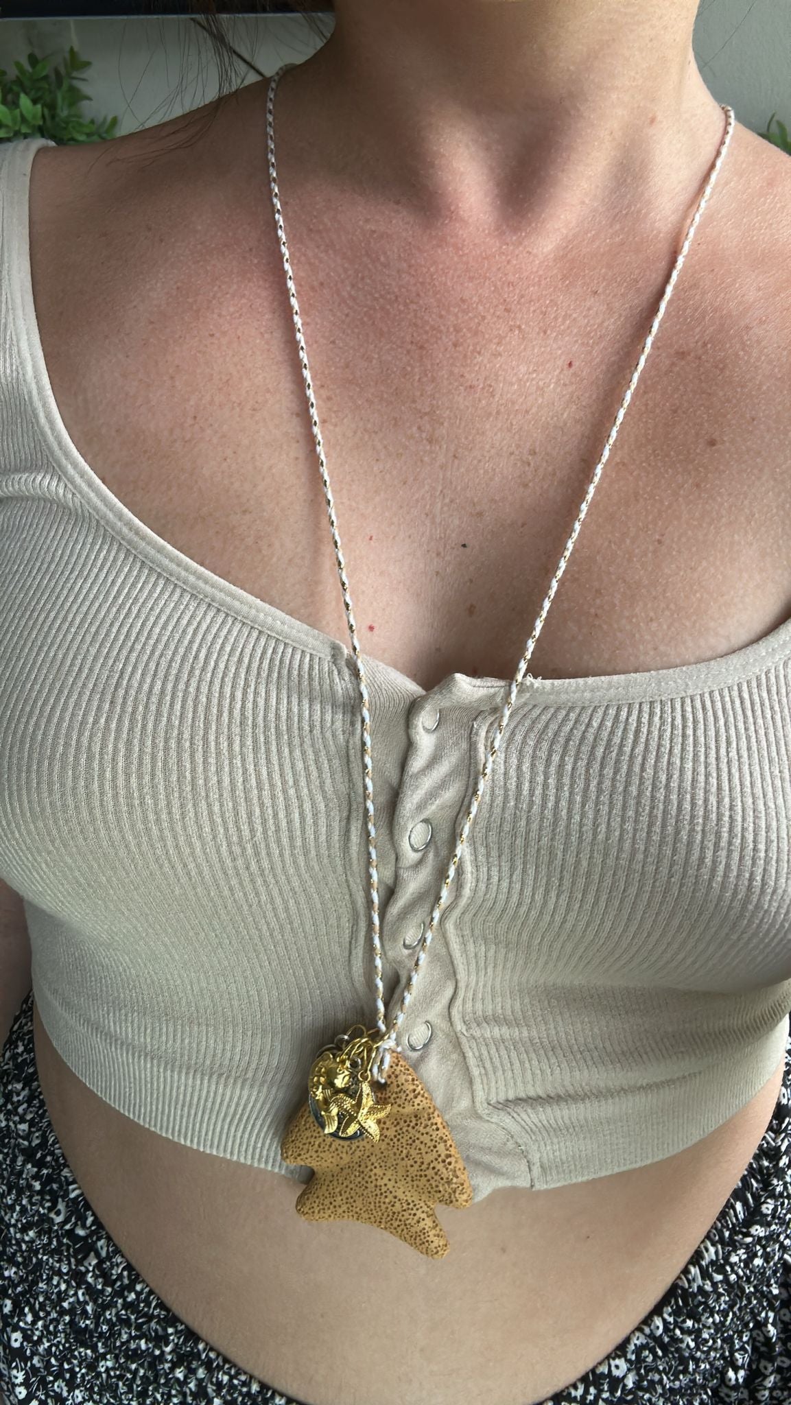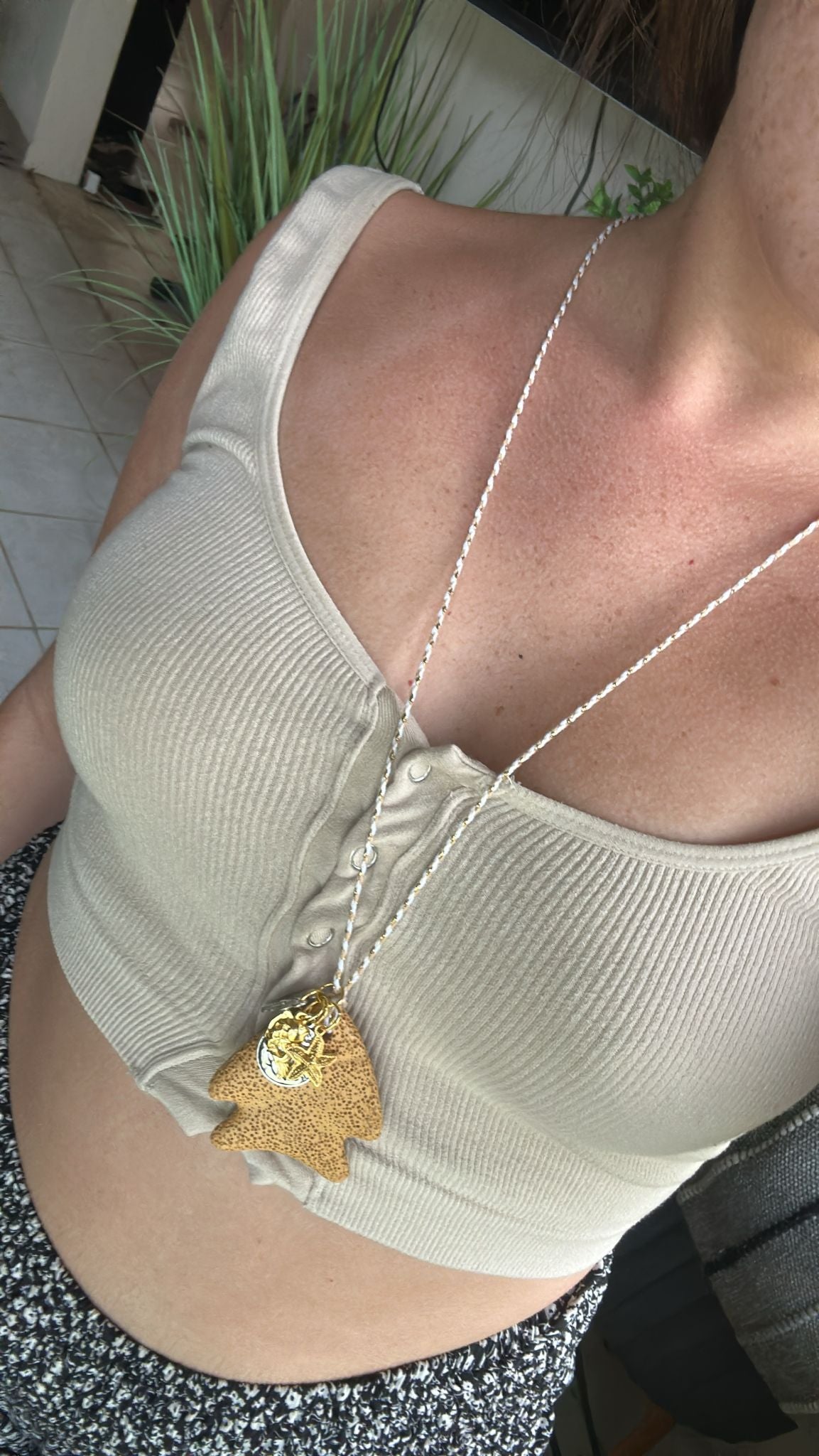 Immerse yourself in the unique beauty of this necklace, where the central fish charm is sculpted from lava, a material that evokes the strength and mystery of natural elements. Hanging delicately on a long thread, this accessory blends the ruggedness of lava with the delicacy of its design. Perfect for sea and nature enthusiasts, this necklace not only enhances your style with its natural elegance but also tells a story of adventure and a passion for the wild. Ideal for adding a distinctive touch to any outfit, this necklace is more than an accessory; it's a statement of your connection to the earth and water.