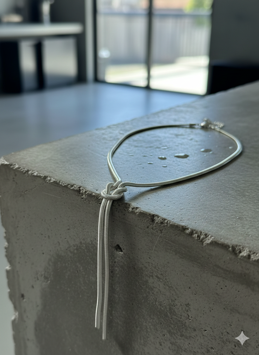 Este collar es pura elegancia con un toque moderno. Su diseño tipo corbata con nudo central crea un efecto estilizado que realza el escote y eleva cualquier look sin esfuerzo. Ideal para llevar solo o como pieza protagonista.