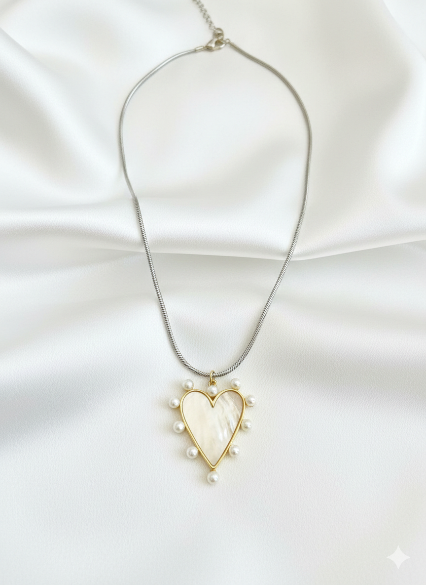 Esta delicada cadena color plata combina a la perfección con un charm en forma de corazón con detalles perlados y baño en oro de alta calidad, creando un contraste elegante y moderno que define el estilo de Sombra Turquesa.