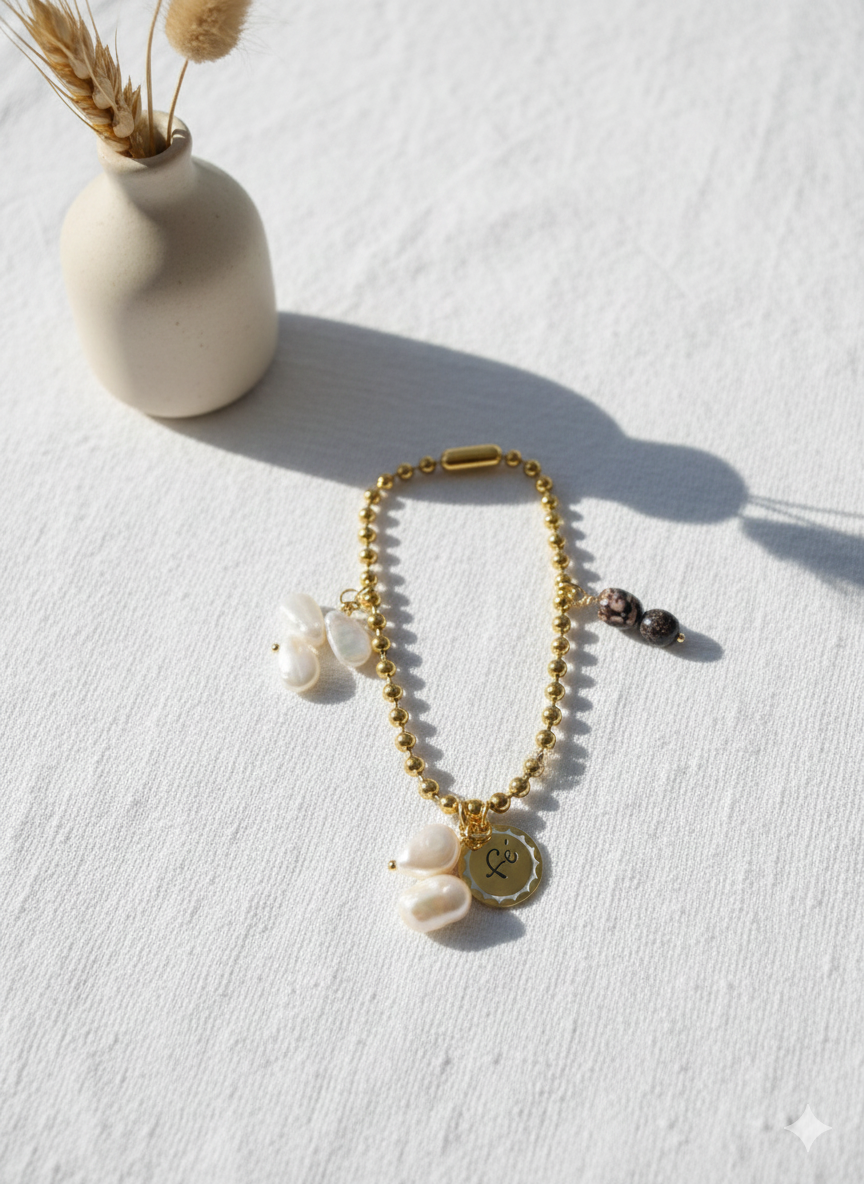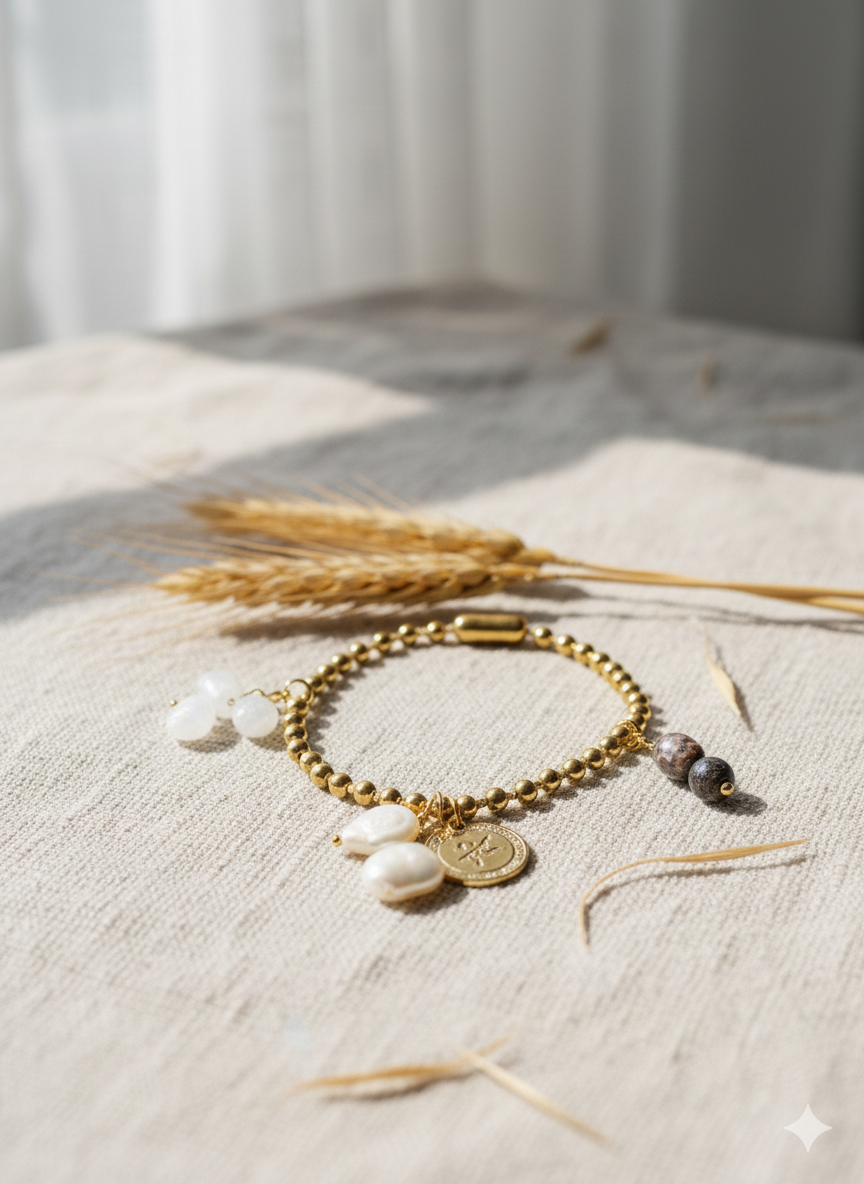 La combinación de rodonita, moonstone y perla de agua dulce aporta calma, claridad y propósito, mientras la medallita FE completa el significado: confiar en tu proceso, paso a paso.